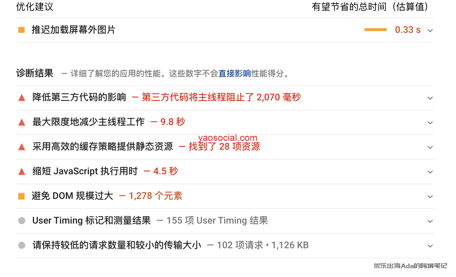 如果页面加载时间过长,会影响SEO的排名,从而增加跳出率。 降低页面加载时长可以有效的提升转化率, 你可以通过google提供的pagespeed Insights工具检测页面打开速度。