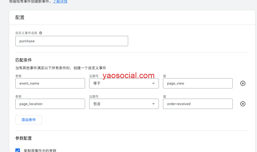 创建事件其实就是在制定规则,用户访问了制定的页面或做了指定的点击操作, 就会被判定是事件达成。由于GA4建立在每个pageview的基础上,所以在创建事件规则时,需要设置2个条件同时满足。 一个是触发了pageview,另一个,比如说访问的page location包含了“thank you”的部分URL。