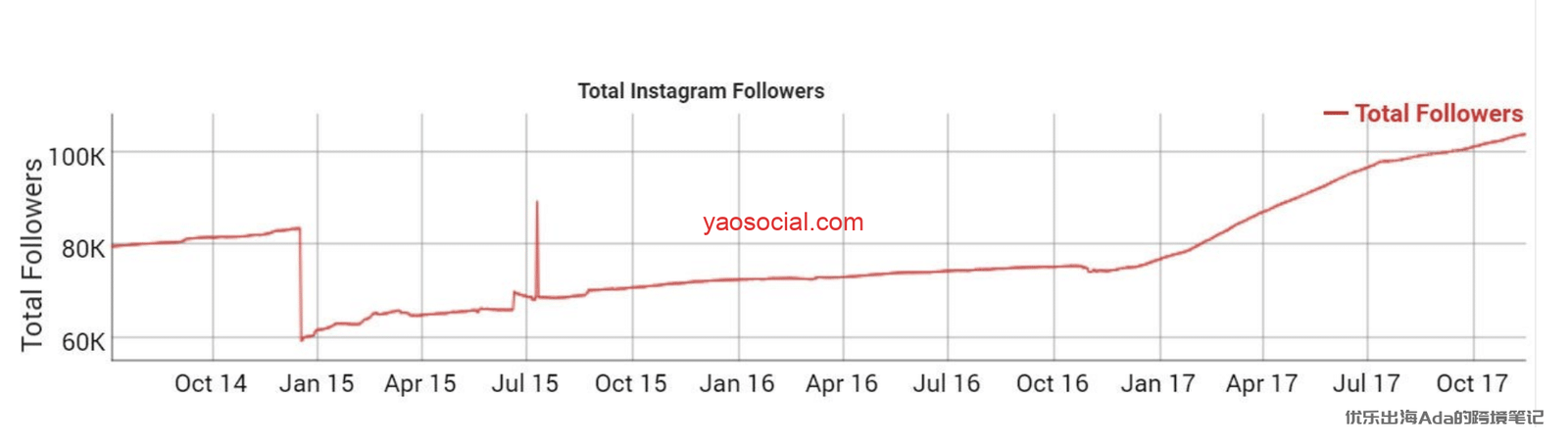 但如果你看到目标网红的图表出现巨大跌幅和尖峰,就像下图这样,目标网红很可能已经买了追随者来夸大他们的粉丝数量。如果你希望创造一个成功的网红营销活动,避开这种情况的网红将对你最有利。