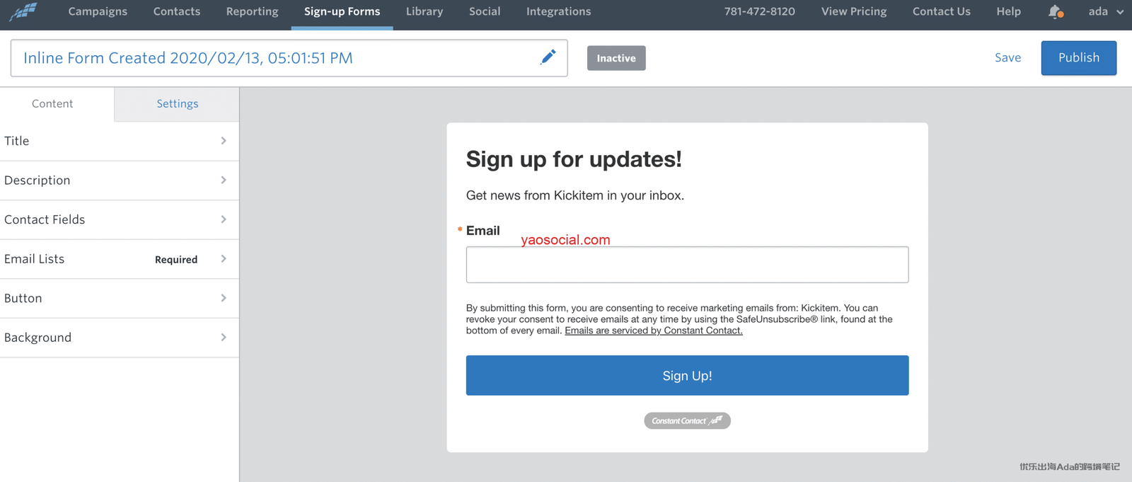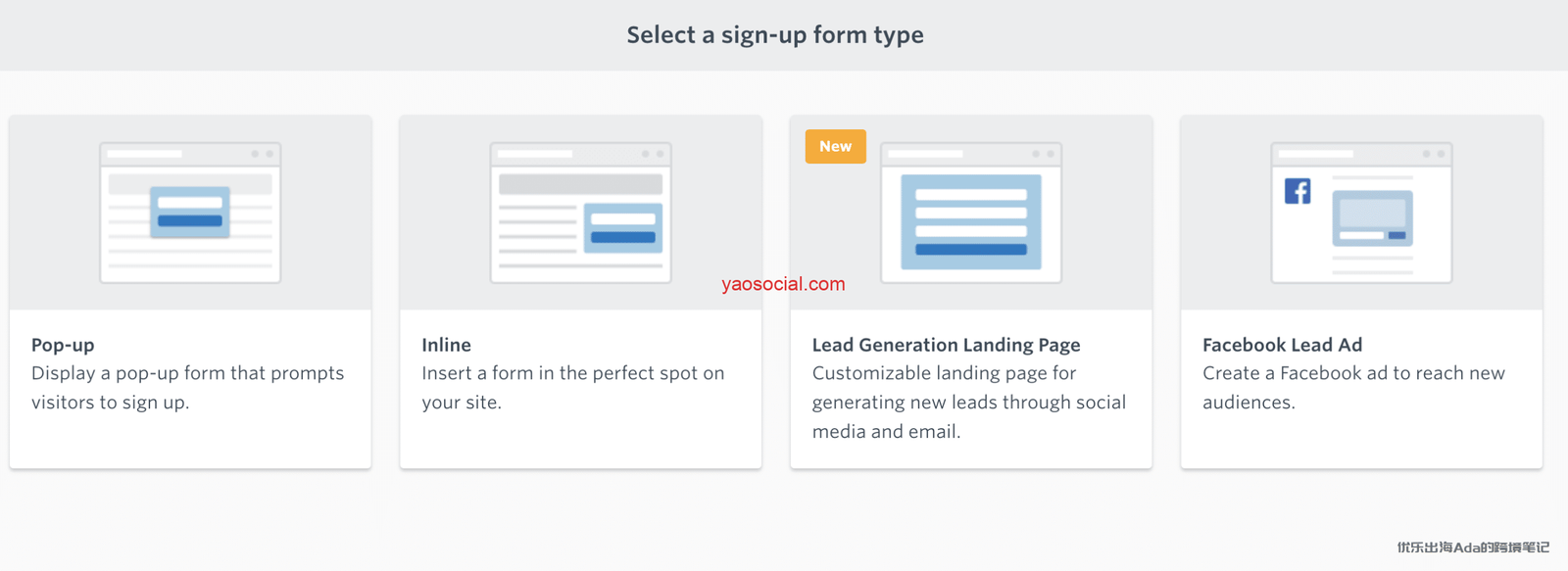 发邮件只是邮件营销中的常规任务,而在邮件营销开始之前, 如何获取更多许可式的订阅邮箱,同样是营销人员需要思考的。Constant Contact便提供了这样的功能,表单收集及网站集成。选择合适的表单形式,弹窗,集成,着陆页或和Facebook广告集成。