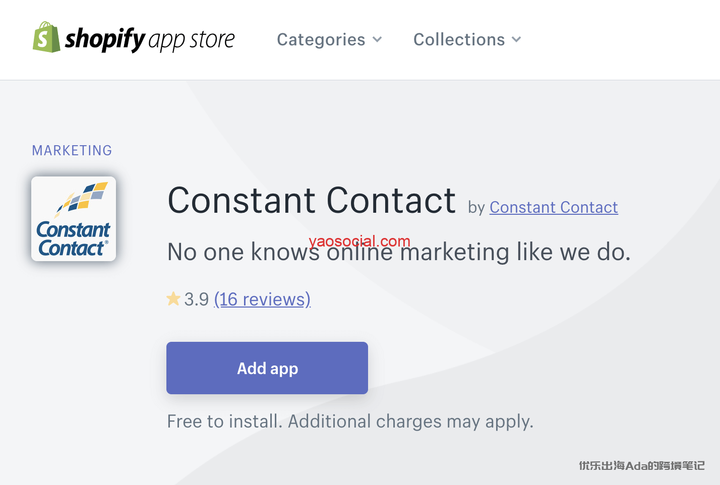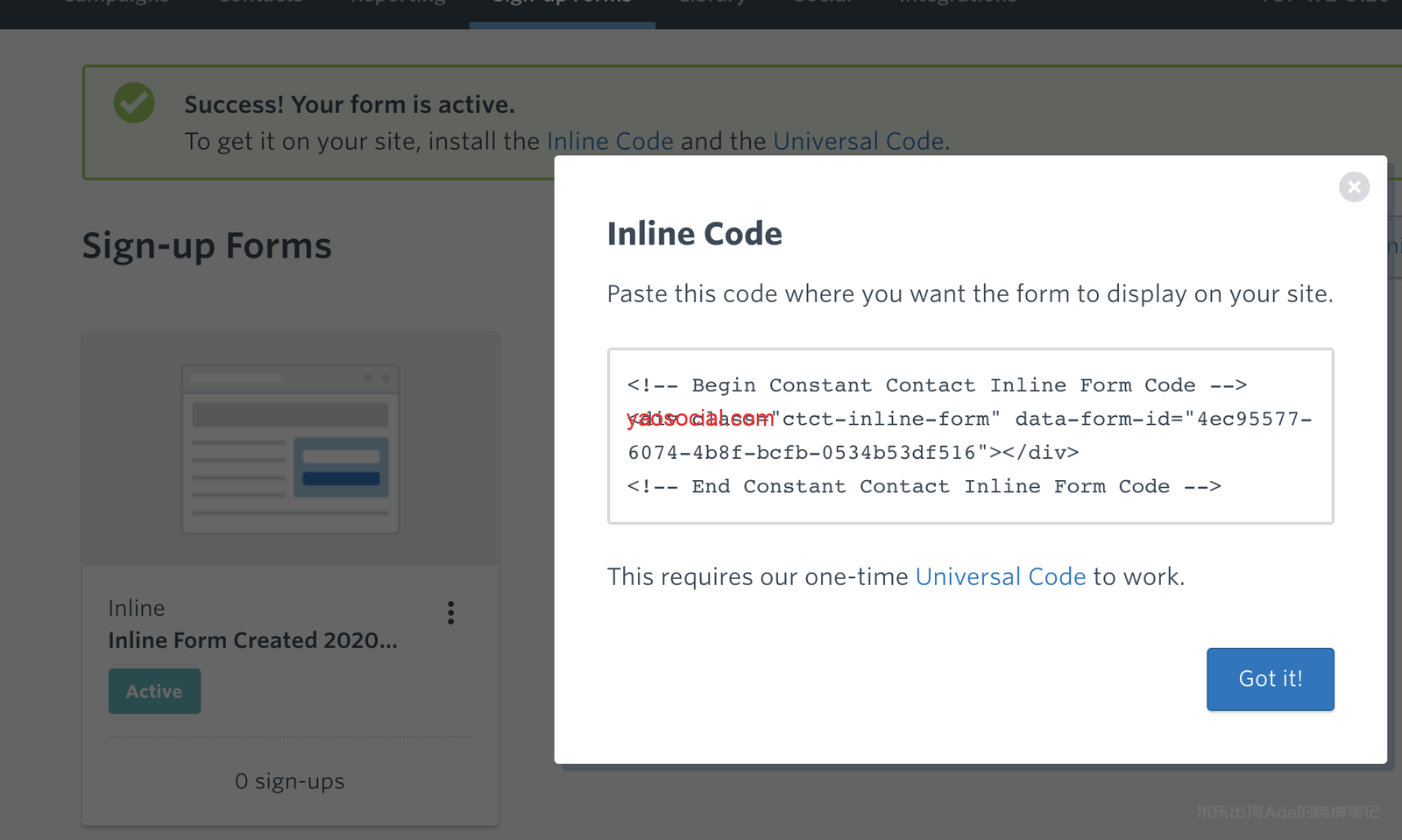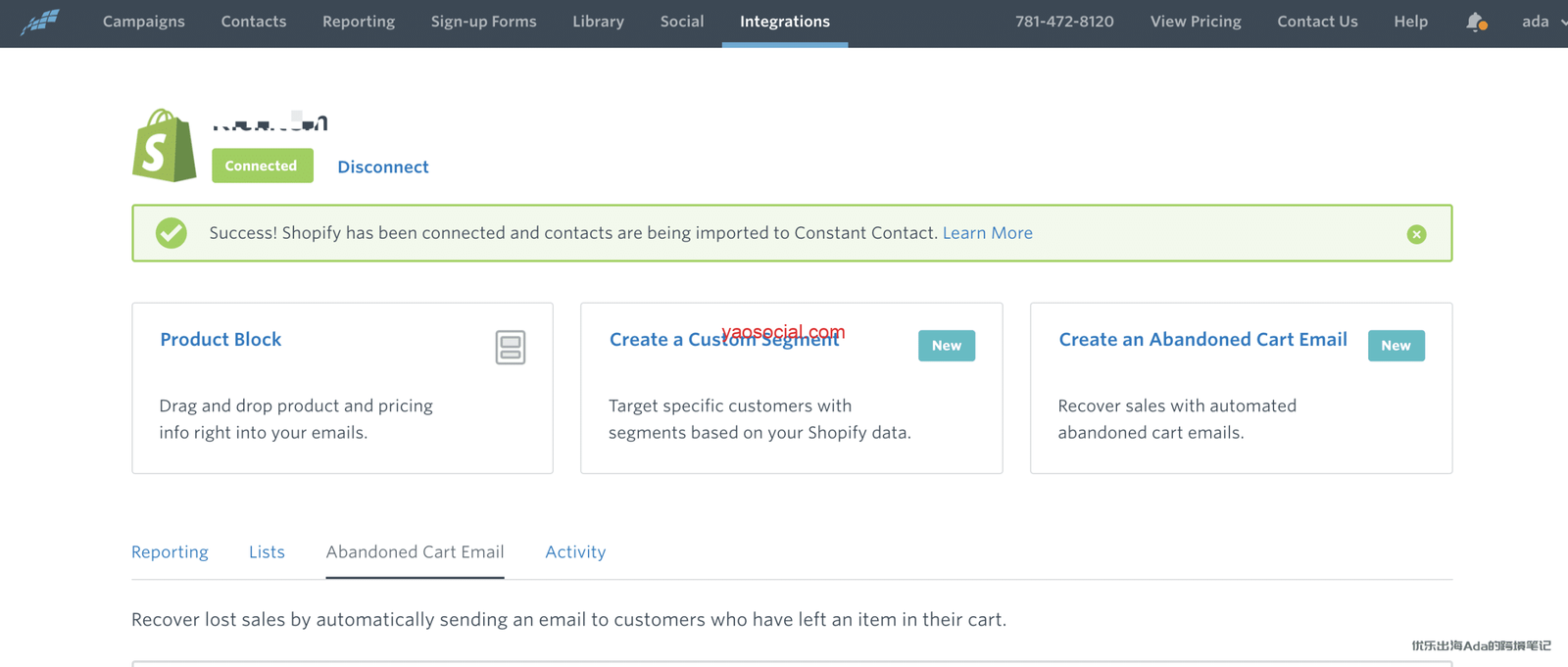 添加成功后,会提示店铺绑定成功。 Constant Contact可以获取你店铺的邮箱了。