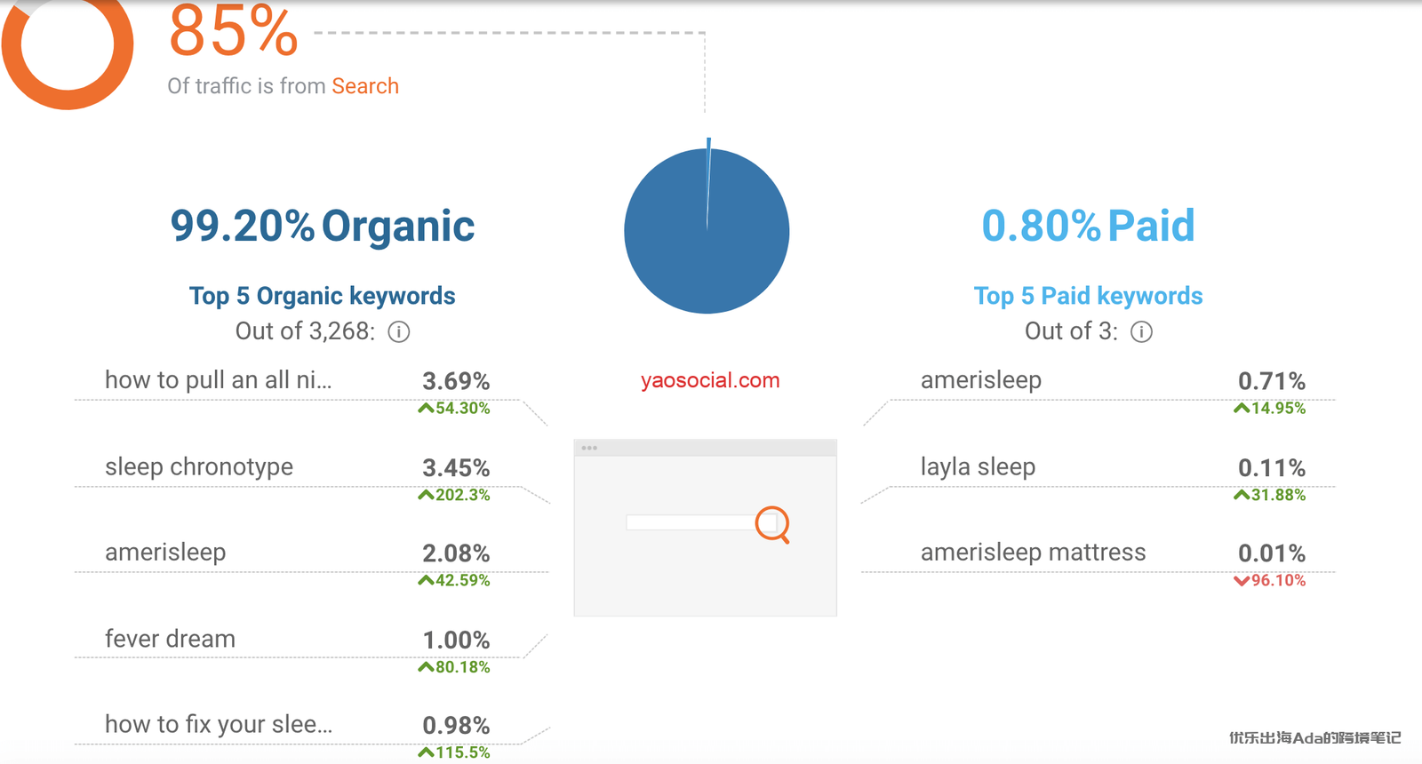 对于一个成立于2005年的网站,通常直接访问量和search量很多时候都会平分秋色,但是在这个网站上,却看到了让人大跌眼镜的数据,网站85%的流量为搜索流量!