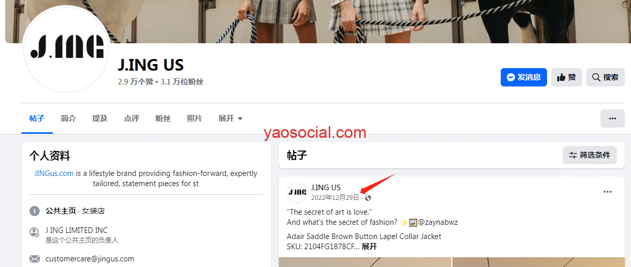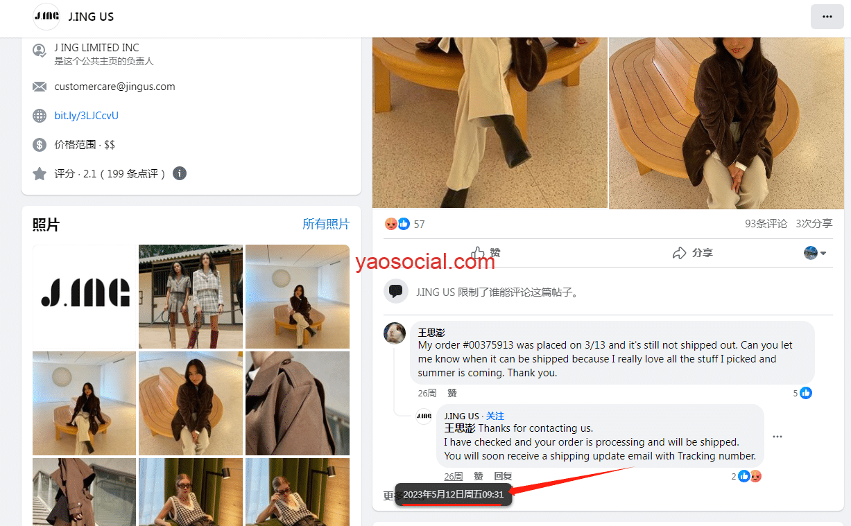 Facebook上的最后一次发帖在2022年12月29日,官方最后一次回复停留在了2023年5月,目前所有帖子限制了回复, 也禁止用户在page上发帖。服装网站最爱的instagram和Pinterest账户也已经注销不在。