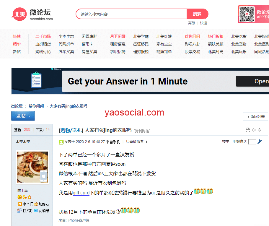 这样的抱怨从华人论坛里爆出也不奇怪,毕竟Jingus在多个华人社群, dealmoon,纽约吃啥哟等公众号中曝光过其品牌,其主要销售人群也是瞄准了北美华人群体。