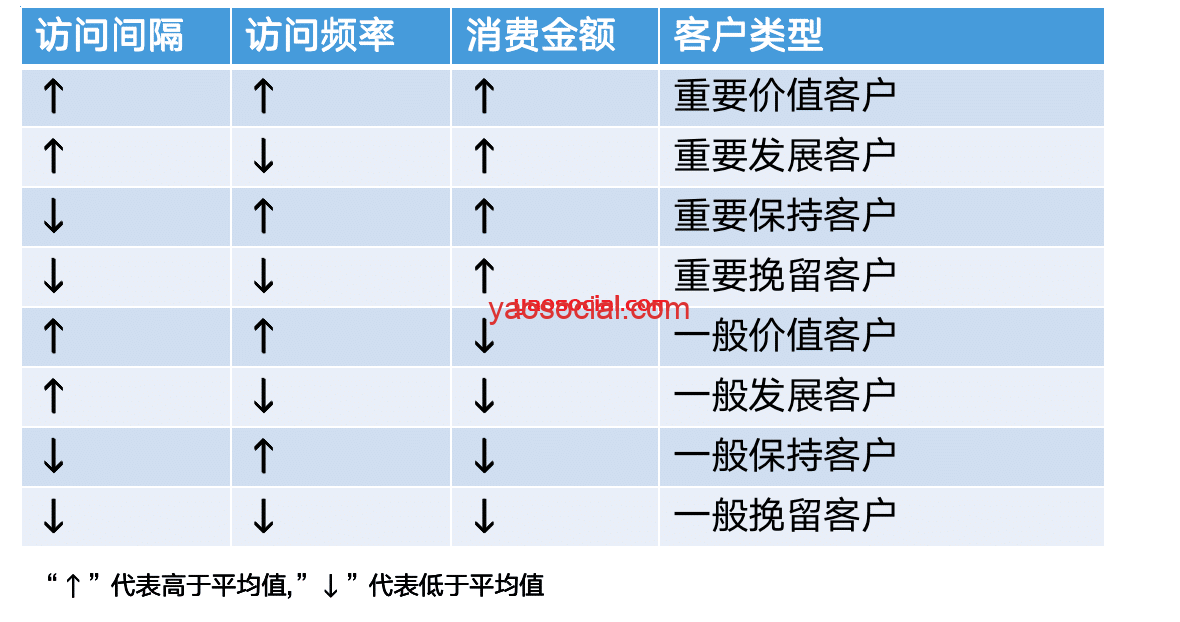 RFM 分别代表:Receny(最近一次消费)、frequency(消费频率)、monetary(消费金额),获取到这3个指标的平均值后,可以在一个三维图形中组合出8种用户群体。