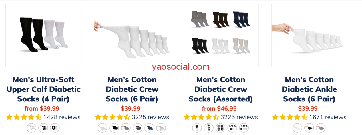 袜子,单价挺低的一个产品,所以为了提高客单价,产品打包无疑是最好的选择。Diabtic对于普通袜子基本都采用了打包销售的方式。 4双、6双装这样。