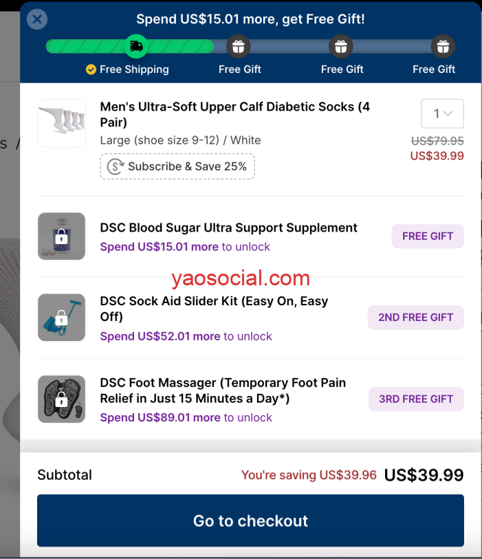 虽然有产品打包策略,但是对于袜子这么轻的产品,用户一次购买多个SKU,对于卖家来说肯定是最好的,因为运费并不会增加多少。所以为了进一步提高客单,这个网站使用了这样的一个插件,叫做“boost”,使用效果参考如下: