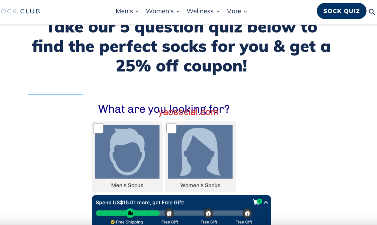 对于用户而言,他只需要知道他的需求,和你的产品特质是否可以解决他的问题即可。所以为了简化用户对专业制造知识的理解,加快用户的购买决策,网站上有一个sock quiz的部分,让通过回答5个问题,从而为用户推荐最适合他的袜子。