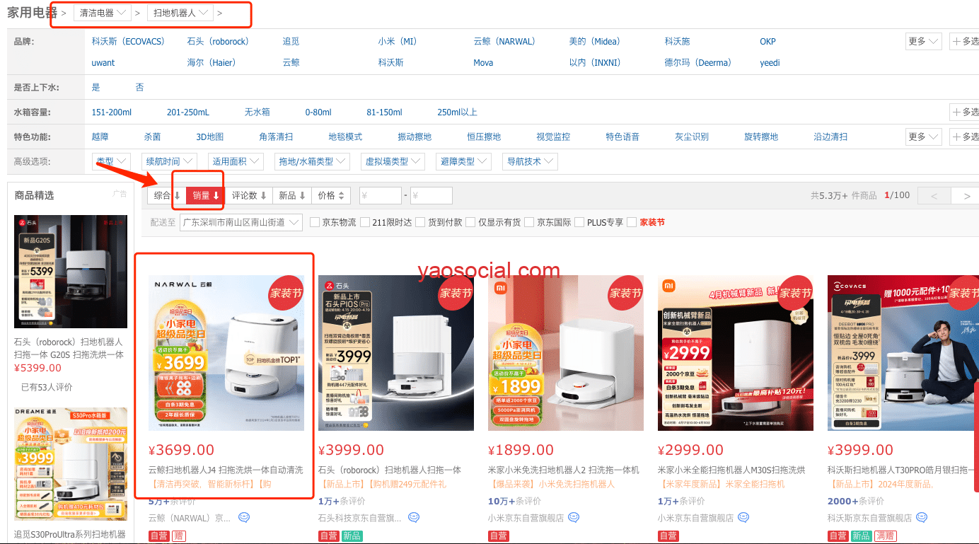 云鲸可能没有徕芬那么有名,不了解的同学可以直接上京东,在扫地机器人类目下直接按销量排序,你就会看到云鲸是目前排名第一的扫地机器人。