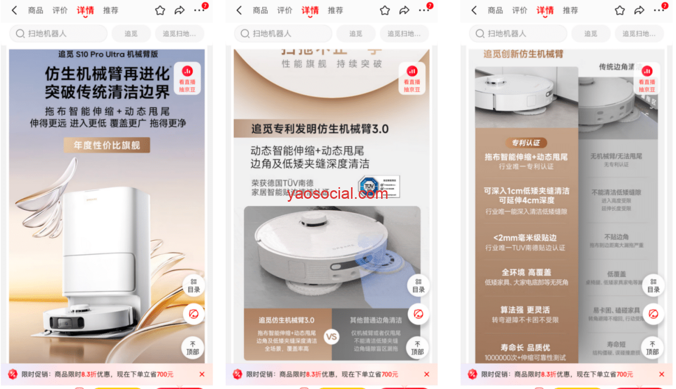 比如下面这个主打机械臂概念的扫地机器人,产品功能介绍的第一屏就是这个机械臂,而且还几乎用了三屏来介绍。