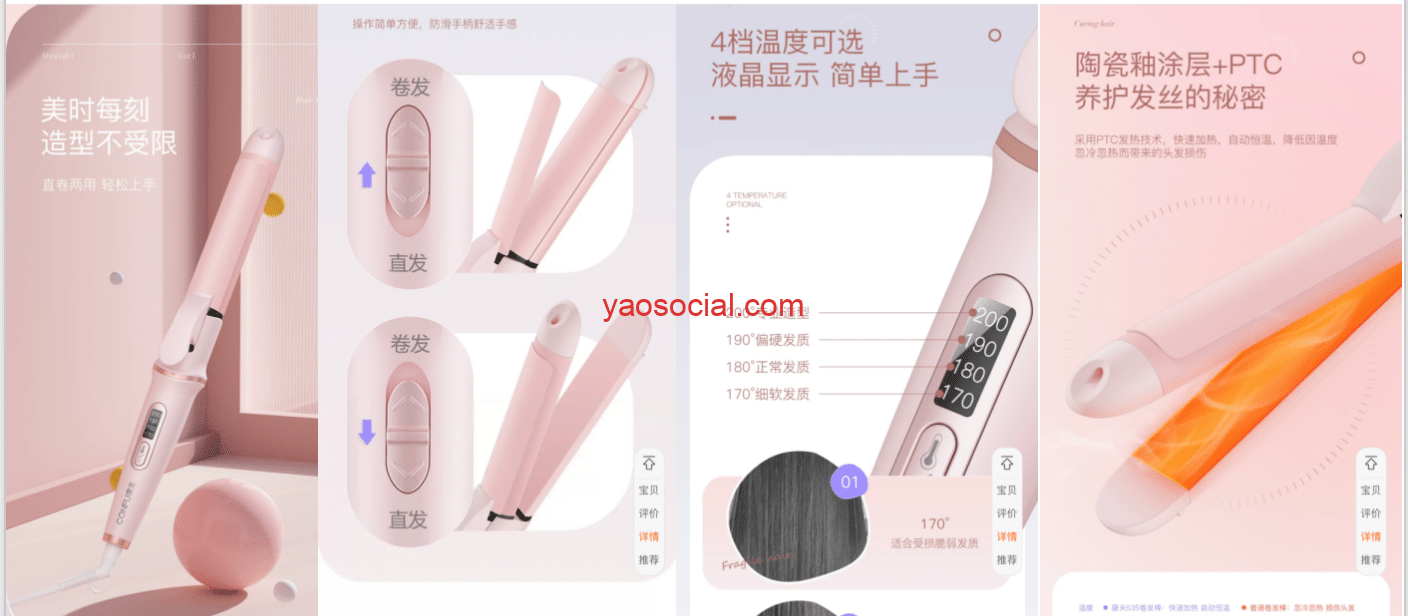 我曾经在淘宝上看到这样一款卷直发棒,它介绍温度,涂层,按钮,外观,但是唯独就不愿意做几张图来介绍下这个卷发棒到底如何才能拉卷头发,如何才能拉直头发!如何使用、能拉成什么样的发型这才是女性用户关注的点啊!!!而这又往往是很多卖家忽视的问题。