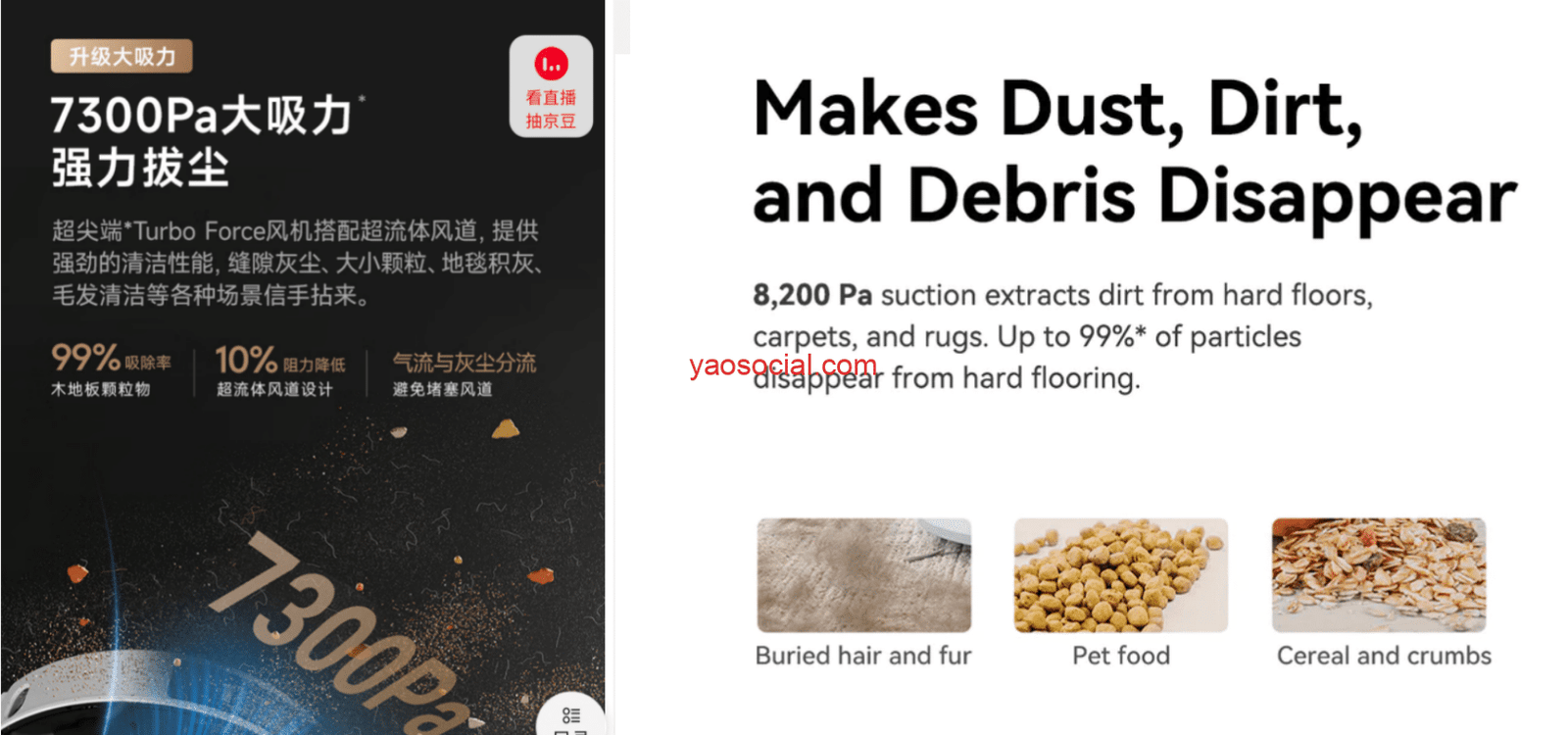 但是你再看看左边的这款,同样是在介绍吸力,他写的是