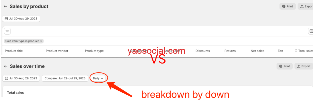 基本上所有商城后台都提供“Compare”的数据。一般使用后台功能,对你你关注的时间段和上个月同周期段的对比,或者去年这个时间段的对比。