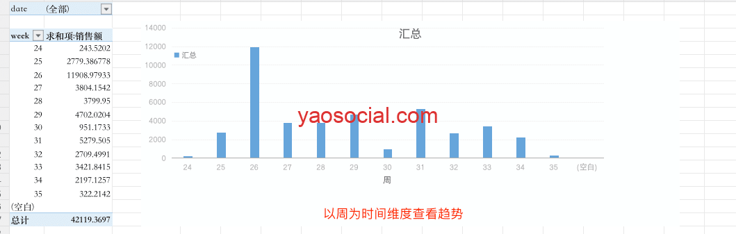 如下图所示,在源数据里增加“周”的时间维度后,使用曲线图为柱状图来查看每周的数据,并对应“网站日志”来定位到销售高峰和低谷的影。
