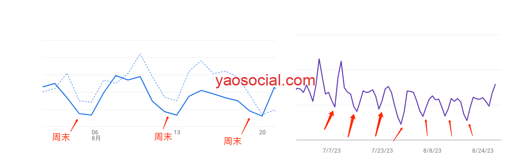 排除掉运营操作带来的影响后,如果在较长的时间周期内,呈现出比较规律的变化,有此可以判断,是市场用户群体的使用偏好带来的影响。 举个例子,我的博客在每周末都呈现出访客量降低,而工作日则趋向正常的时态,通过GA4和GSC上的的impression展示数据,都可以看到这样的稳如心电图般的数据。同时也对比其他行业内的网站,如AMZ123等,他们的百度指数也同样呈现出了周末热度下降的心电图般的规律。