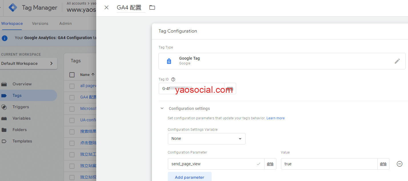 4, 填写完Tag ID后, 在 configuration settings的configuration parameter填写如下字段” send_page_view”, value 为 true。 最后点击保存