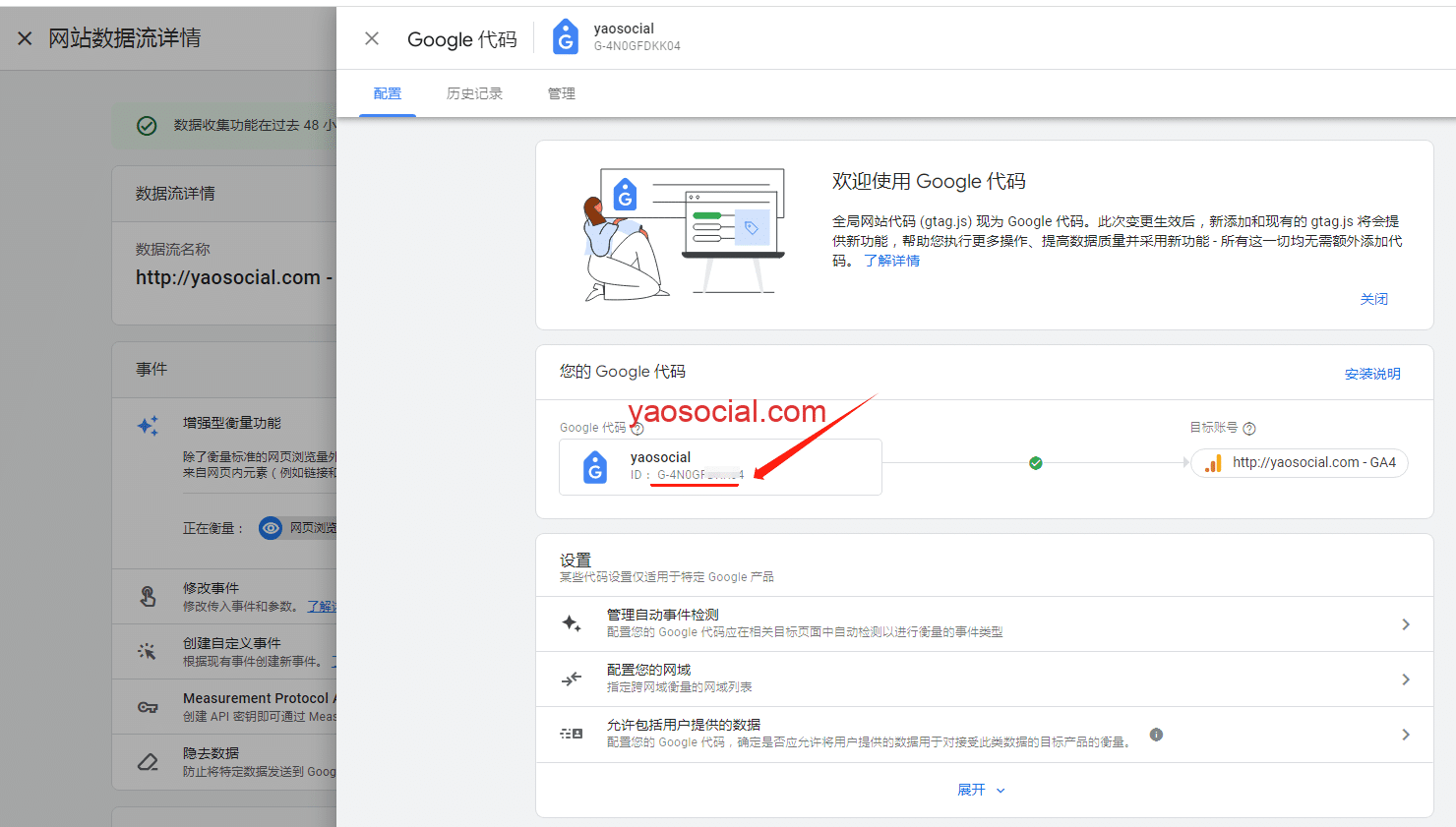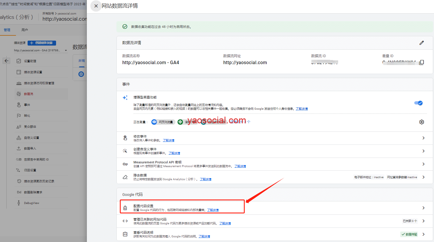 2,在网站数据流详情页面点击“Google代码”下的 “配置代码设置”
