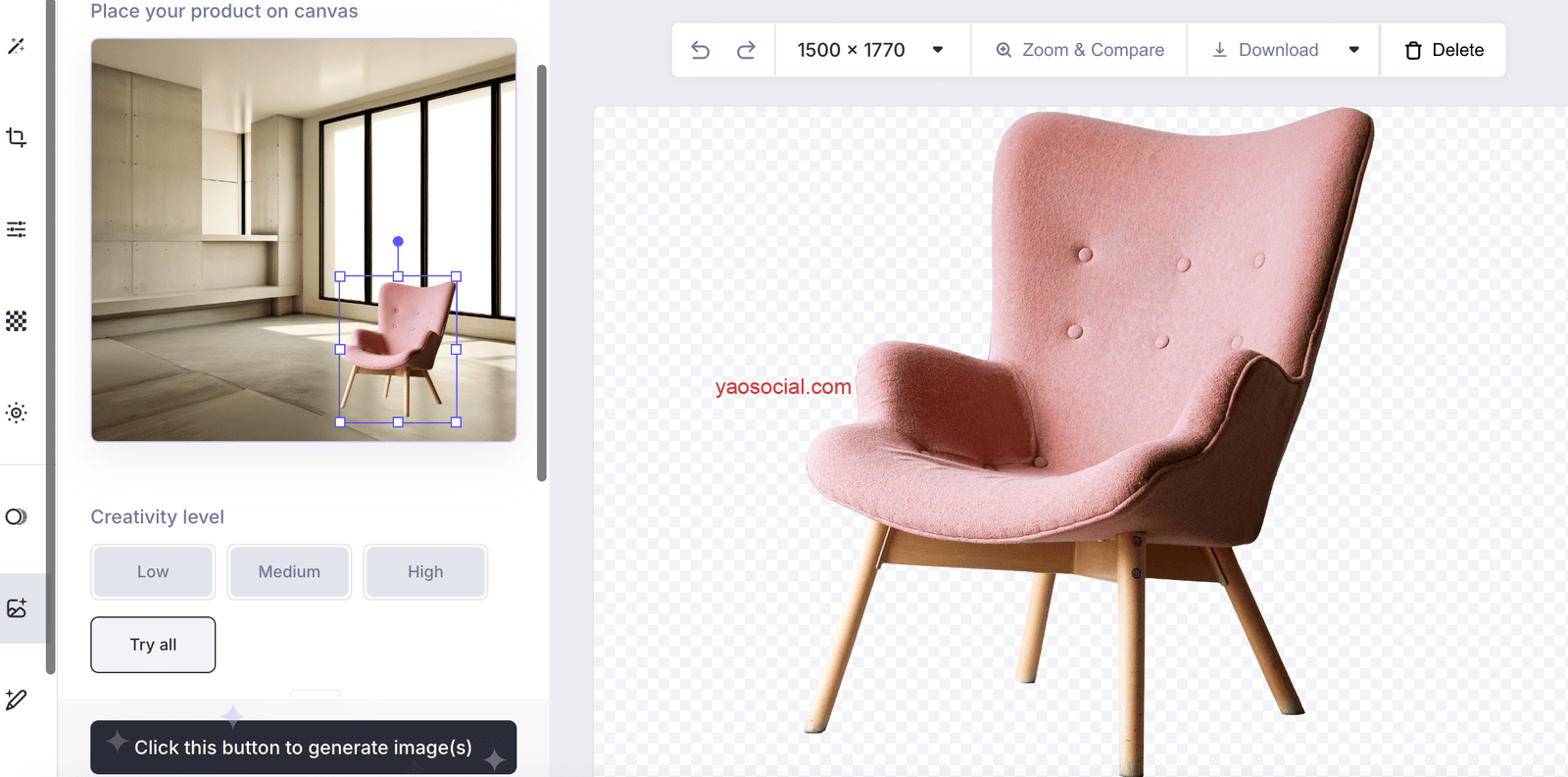 比如我现在需要把一个椅子放在一个室内空间,在选择好背景模板后,再选择产品图,你就会看到下面这样的界面。