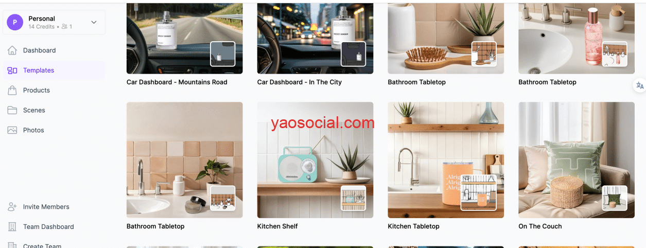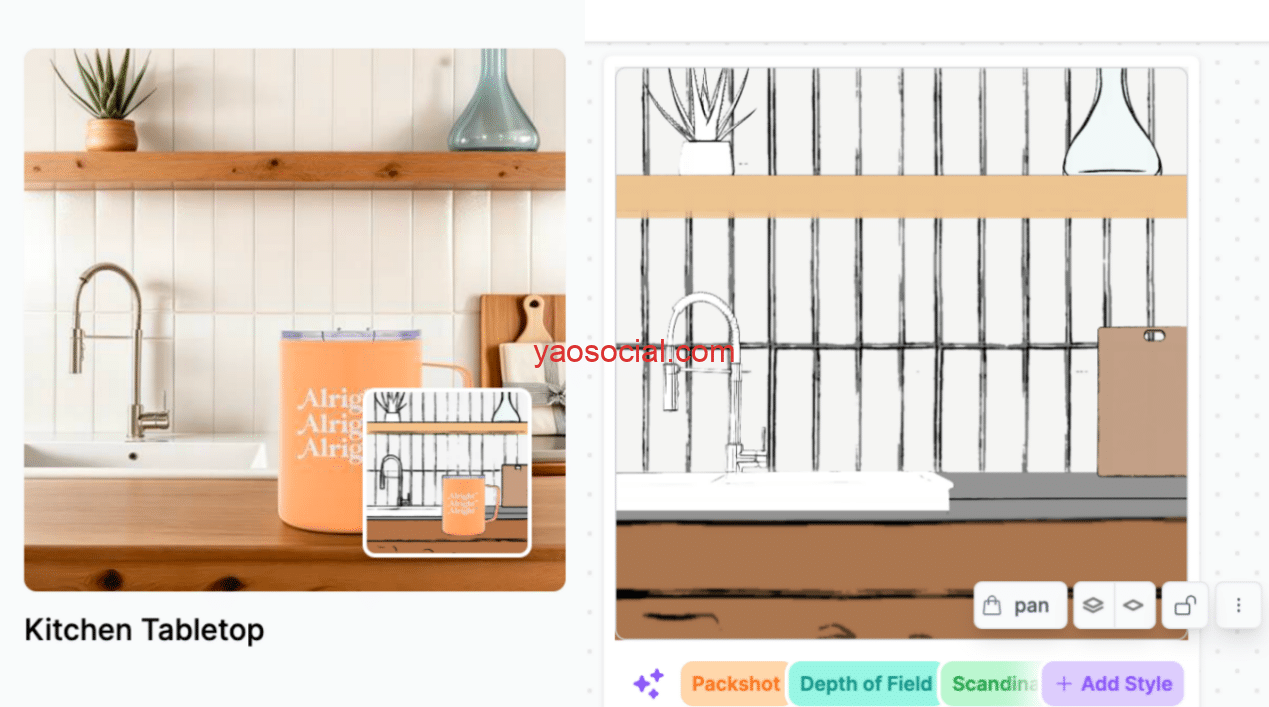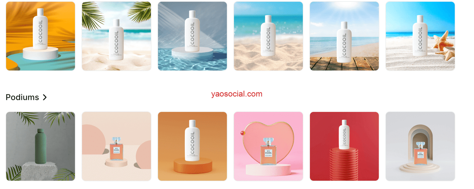 在选择背景场景的时候, 需要注意的是, 你上传的产品摆放角度需要和该场景匹配。比如一个是俯拍的场景,也就需要你上传一个俯拍角度的产品图片了。