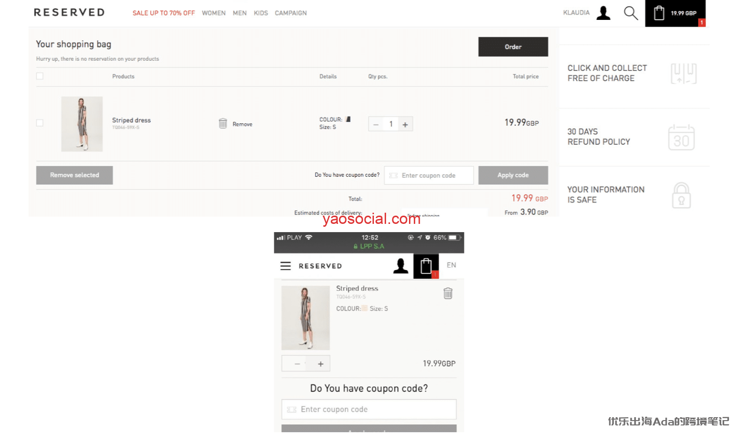 50%以上的电商流量都在移动端,所以对于客户而言,他们会从移动端切换到PC端,然后在PC端上完成交易。所以请确保购物车里的内容是和个人账户绑定的,这样用户无论是在PC还是移动端,都可以找到他之前加入到购物车的产品。