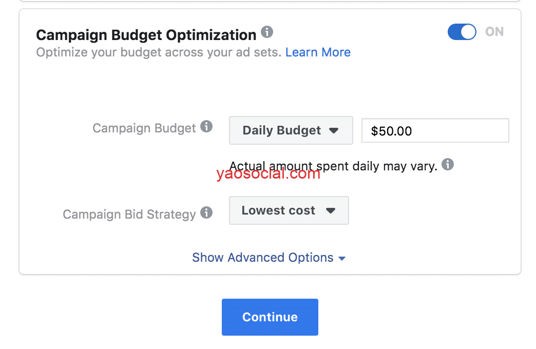 Campaign的objective选择conversion, 接下来就选择CBO,预算暂时先定到50刀, 这只是一个建议, 你可以根据你自己的实际情况提高或者降低预算。