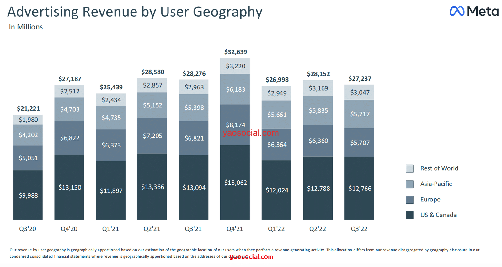 Meta也在10月26日发布了其第三季度的财报,第三季度的广告收入为$27.23 billon,比起Q2的$28.15 billion有环比下降,同比2021年Q3的$28.27 billion,也依旧有所下降。