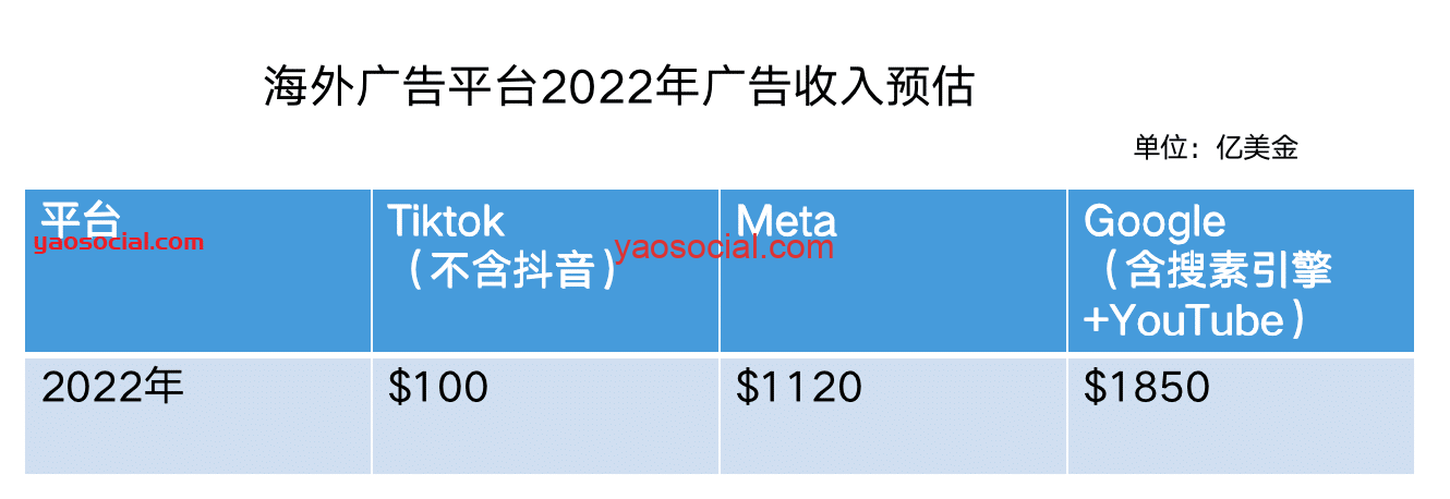 由于Tiktok还未上市,所以没有像meta和谷歌每季度发布财报,关于Tiktok的2022年广告收入,都是援引了 Tiktok CEO的讲话。Tiktok广告之前预计2022年的广告收入是$12 billion,但是在11月8日,其CEO周受资宣布受到经济下滑影响而调低了这一预期,砍了20亿,预期改为了$10 billion。