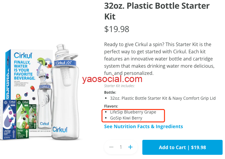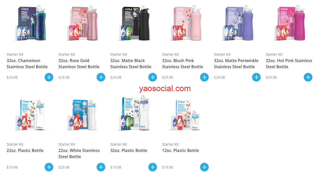 我们仔细看Cirkul的新手套餐,塑料杯无论大小都是19.98美金,而不锈钢杯无论大小都是29.98美金,每个杯子自带两个风味胶囊。