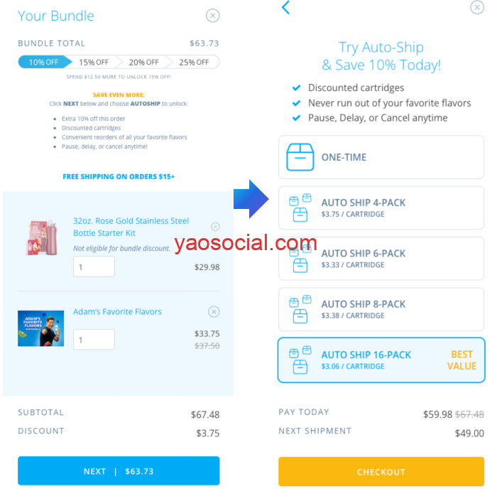 而Cirkul的订阅则是集成到了付款流程里,当用户在购物车里点击下一步后,就会进入到auto-ship的选项,用户可以选择是一次性购买,还是定期发货。