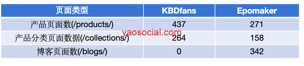 有人说,是不是因为epomaker的SKU数量很多才造成了他们之间的差异,然而并不是!我们通过分析被谷歌收录到的页面数量进行了分类统计,发现了这样一组有趣的数据对比。