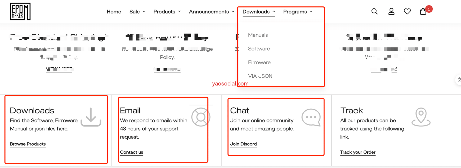 epomaker在页面设计上,是真的考虑到了这类产品上,用户的需求和可能存在的问题,所以他在设计网站时,首页导航有明确的“download”引导用户他可能需要用到的驱动、使用手册、固件、Json文件,在prefooter区域,也有清晰的关于售前和售后的帮助指引(prefooter是全局设置,会出现在网站的每一个页面)。