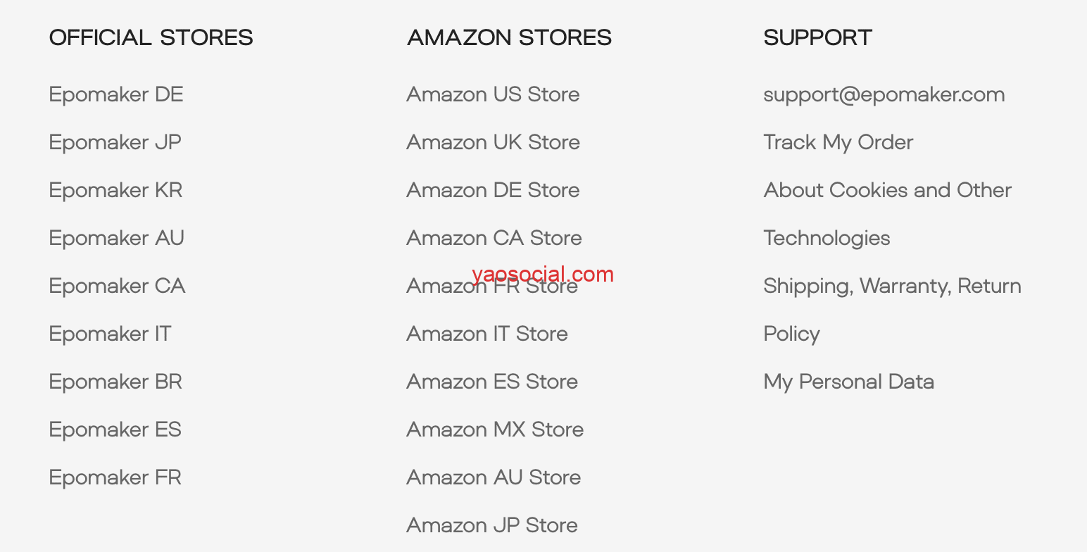 渠道分销售渠道和流量渠道。在销售渠道上,epomaker除了在独立站上进行销售,亚马逊也是他的重要销售渠道,从Footer上可以看到,epomaker的亚马逊国家站点还挺多