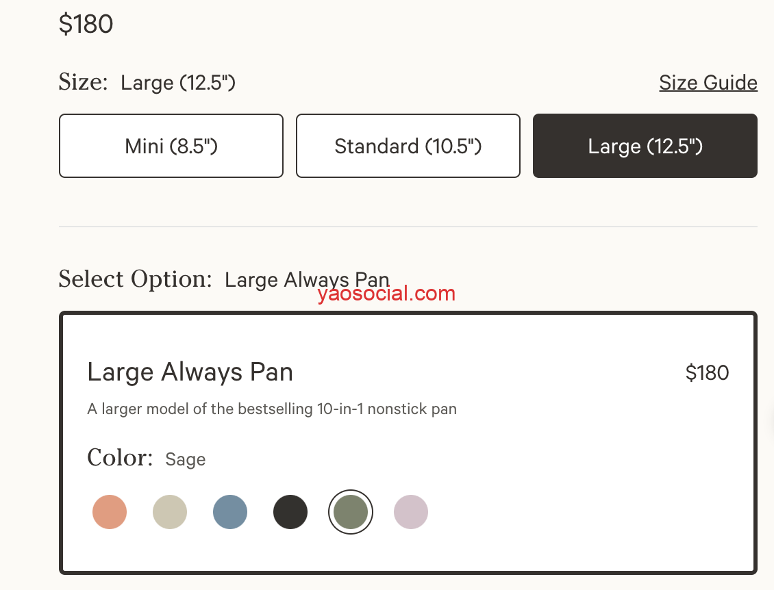 同样,在锅的尺寸大小上,ourplace也做了减法,在其他品牌的煎锅可以提供7-8个尺寸的时候,ourplace的的always pan只提供了3个尺寸。而在早期2019年的always pan,只提供1个尺寸–常用的10寸锅。所有的资金和人力都优先用于颜色的市场测试。