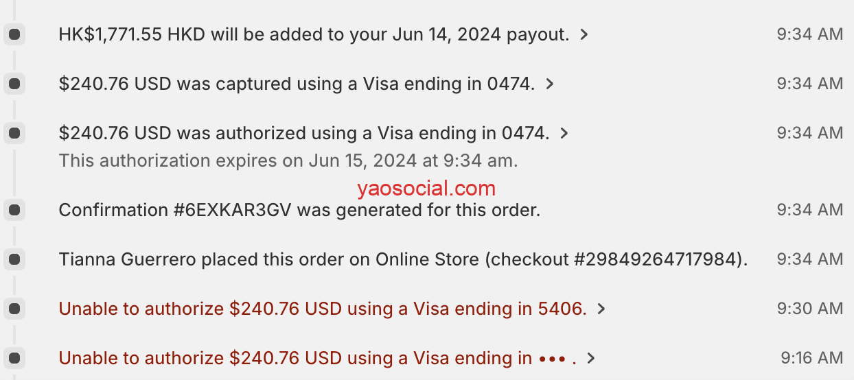 3,查看订单详情中的timeline,它会显示用户在支付这个订单时,尝试支付了几次。比如下面这个高风险订单,客户在支付时,更换了2张信用卡才支付成功。