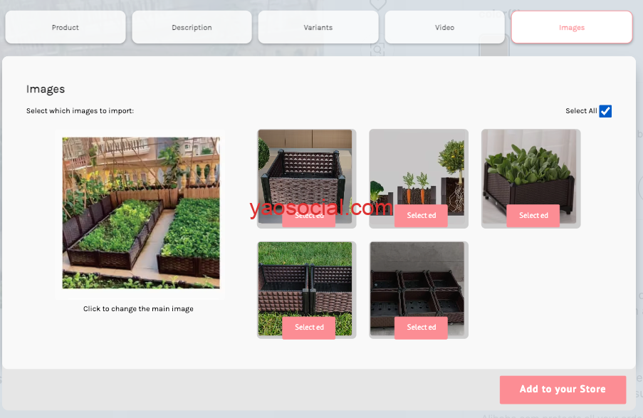 这时回到alibaba的前台产品详情页,在页面上点击Add后,就会看到这样的一个界面,将当前产品的品名,描述,变体,视频,图像分别罗列出来,这样你可以选择需要同步过去的内容。我想这应该就是premium版本中对Product Customize的定义,用户可以自行选择同步什么内容到网站。