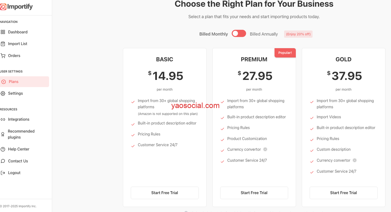 跳转到插件后台后, 你首先看到的是套餐页面, premium 套餐和basic套餐的差异就是多了一个产品自定义和货币自动转化器。但是插件不提供完全的免费试用, 如果你不付费的话,根本无法尝试他们的功能。好在软件方提供一天的免费试用,如果你觉得不合适可以在一天内取消掉。