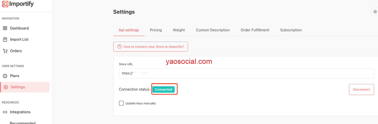 在进行下一步的导入之前,务必在importify后台的setting界面检查是否关联成功, 确保有下图中的connected提示。
