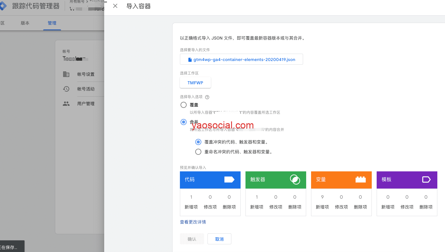 关注公众号“ada的跨境笔记”后回复datalayer就可以拿到文件。解压后按照下图的方式上传。 选择一个新的工作区,导入选项为合并,覆盖冲突的代码、触发器和变量
