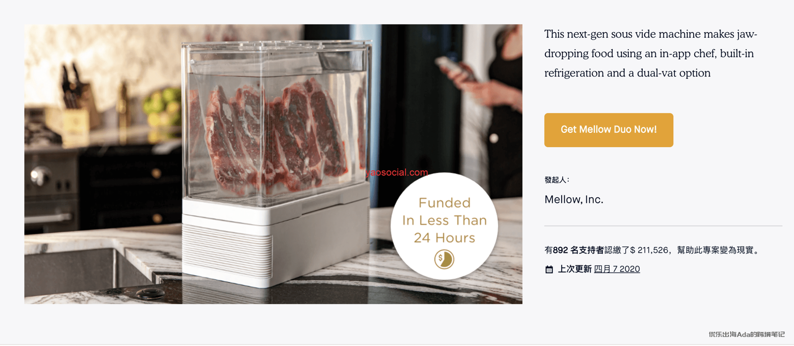 所以一开始他们选择了在Kickstarter上进行众筹,地址: https://www.kickstarter.com/projects/mellow-duo/mellow-duo-perfect-sous-vide-meals-with-a-press-of-a-button