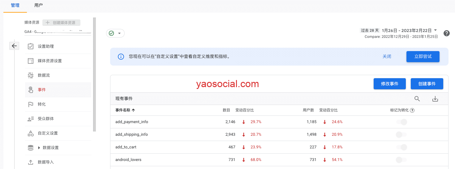 进入到GA4后,点击左下脚的设置,找到“事件”选项,然后选择 创建事件