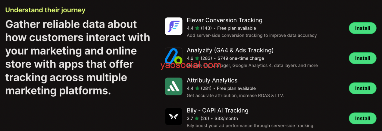 - 使用第三方pixel插件帮你配置各种事件,界面友好,简单易懂, 类似下面这些。当然价格也是很美好了,除了有一次型收费749美金的analyzify,还有月费甚至高2000美金的attribuly。