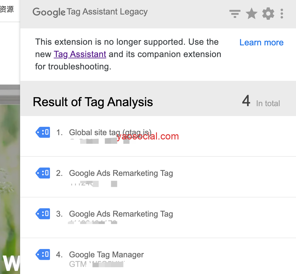 使用google Tag Assistant Legacy去检查网站上是否成功检测到你的google tag manger的ID和global site tag的ID。