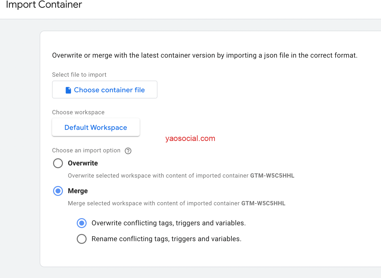 进入到你的GTM – admin-import container,将我提供的json文件上传上去。 是用Merge还是overwrite,根据你自己的情况定。