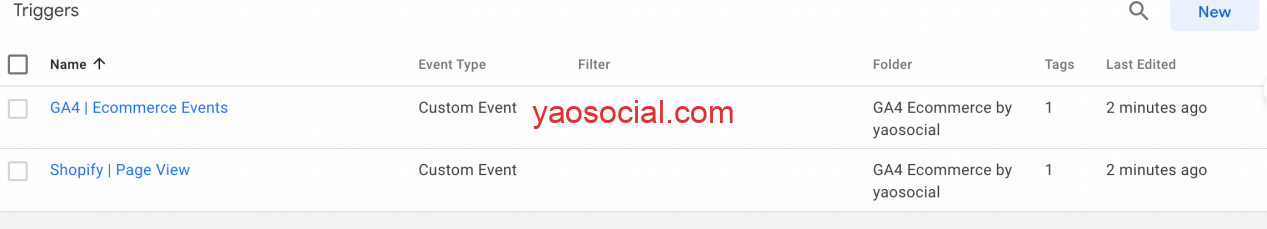 在ecommerce event的触发器下,设置了多个事件,包含view_item|view_item_list|select_item|add_to_cart|remove_from_cart|view_cart|begin_checkout|add_payment_info|add_shipping_info|purchase