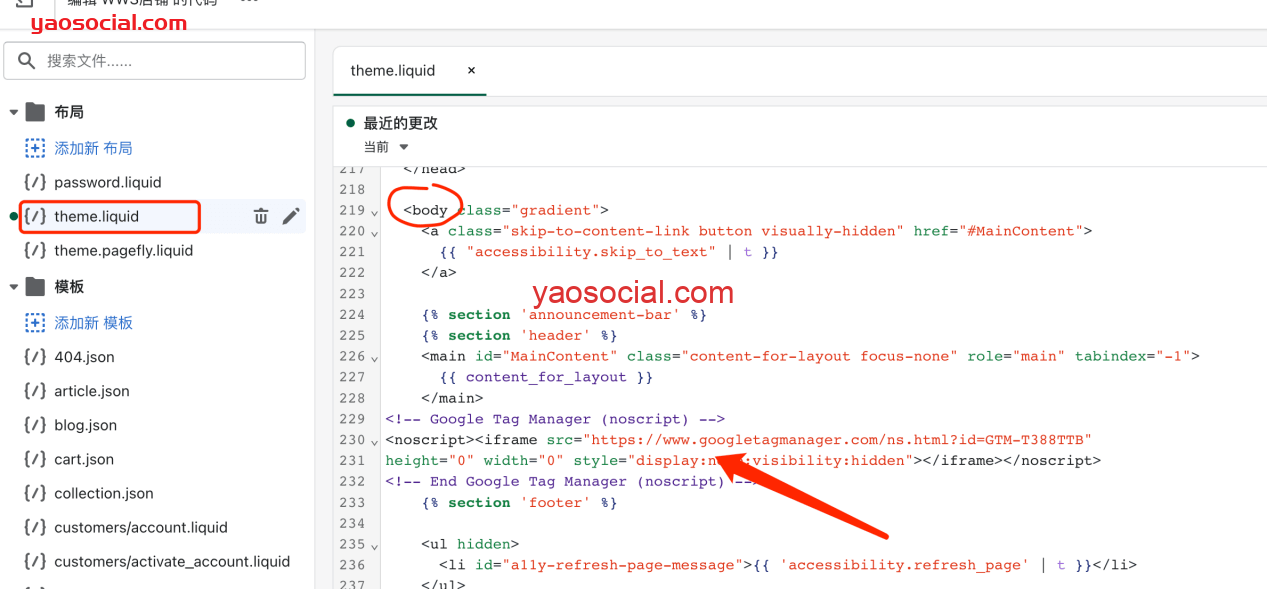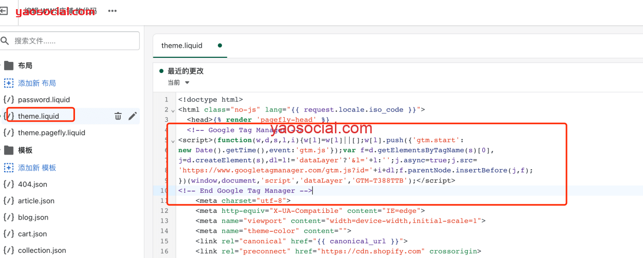 5)找到theme.liquid 这个模板,把GTM提供的第一段代码放在第一个<head>的前面。
