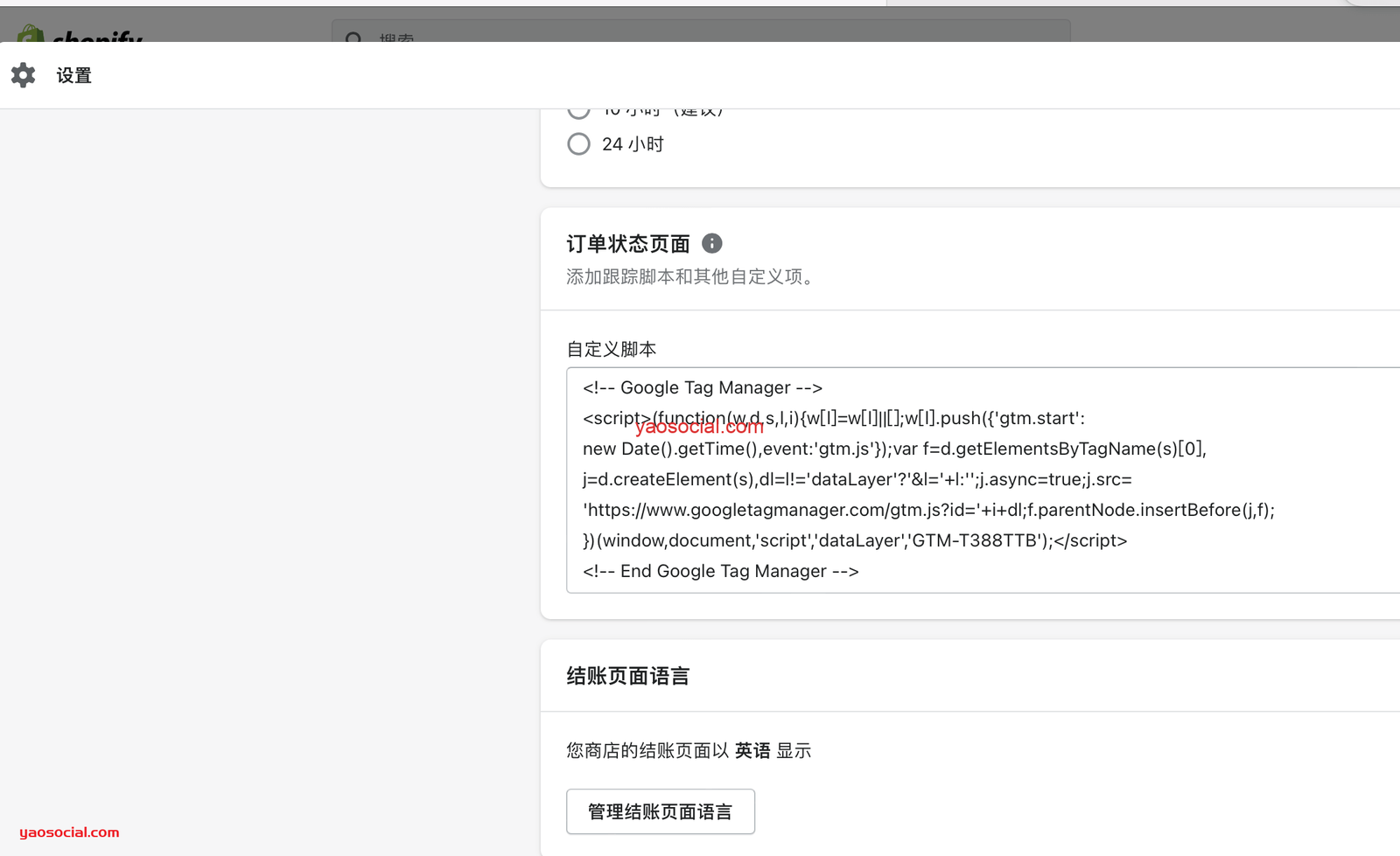 7)在Shopify的结账页面把第一段代码复制进去。 路径是Shopify后台-设置-结账, 页面最下方的位置。不要问原因,照着做就是了。