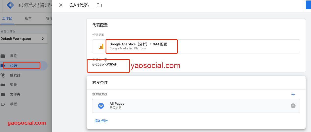 接着我们回到Tag Manager界面, 点击左侧“代码”,在页面右上角点击“新建”,按照下图所做选择和配置。衡量ID就是来自GA4数据流里的,刚才没关的页面。