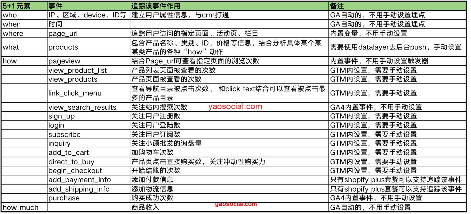 在这张图中,我列出了该指标的作用和设置的注意事项。有些动作和指标,是不需要我们手动去设置的,比如用户的IP、区域、设备,访问时间、时长等指标,这些GA都会自动记录;有些会受到Shopify版本的限制而无法追踪的,比如add_paymanet_info和 add_shipping_info。