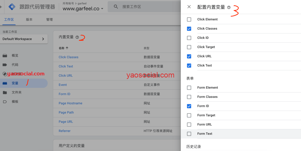 当你第一次进入到GTM后台,点击“变量”,你会发现GTM默认给你提供了大概10个内置变量,但是这不够,所以需要你点击页面右侧的“配置”按钮,去勾选更多变量。