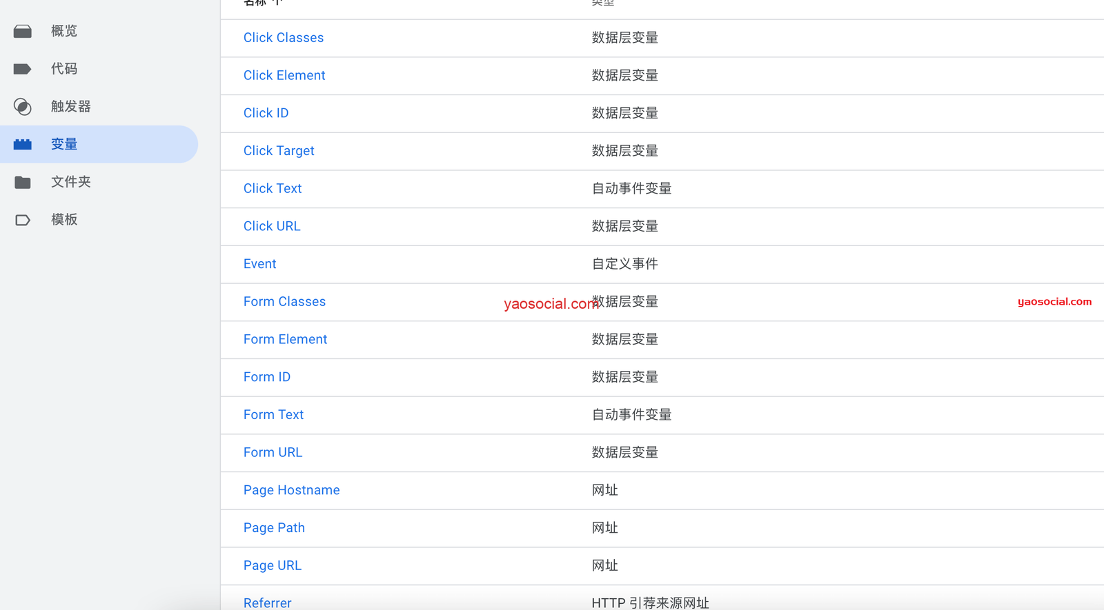 在跟踪代码管理器的界面,左侧导航中包含了以下内容,而我们最常用其实就是代码、触发器、和变量这三个选项。